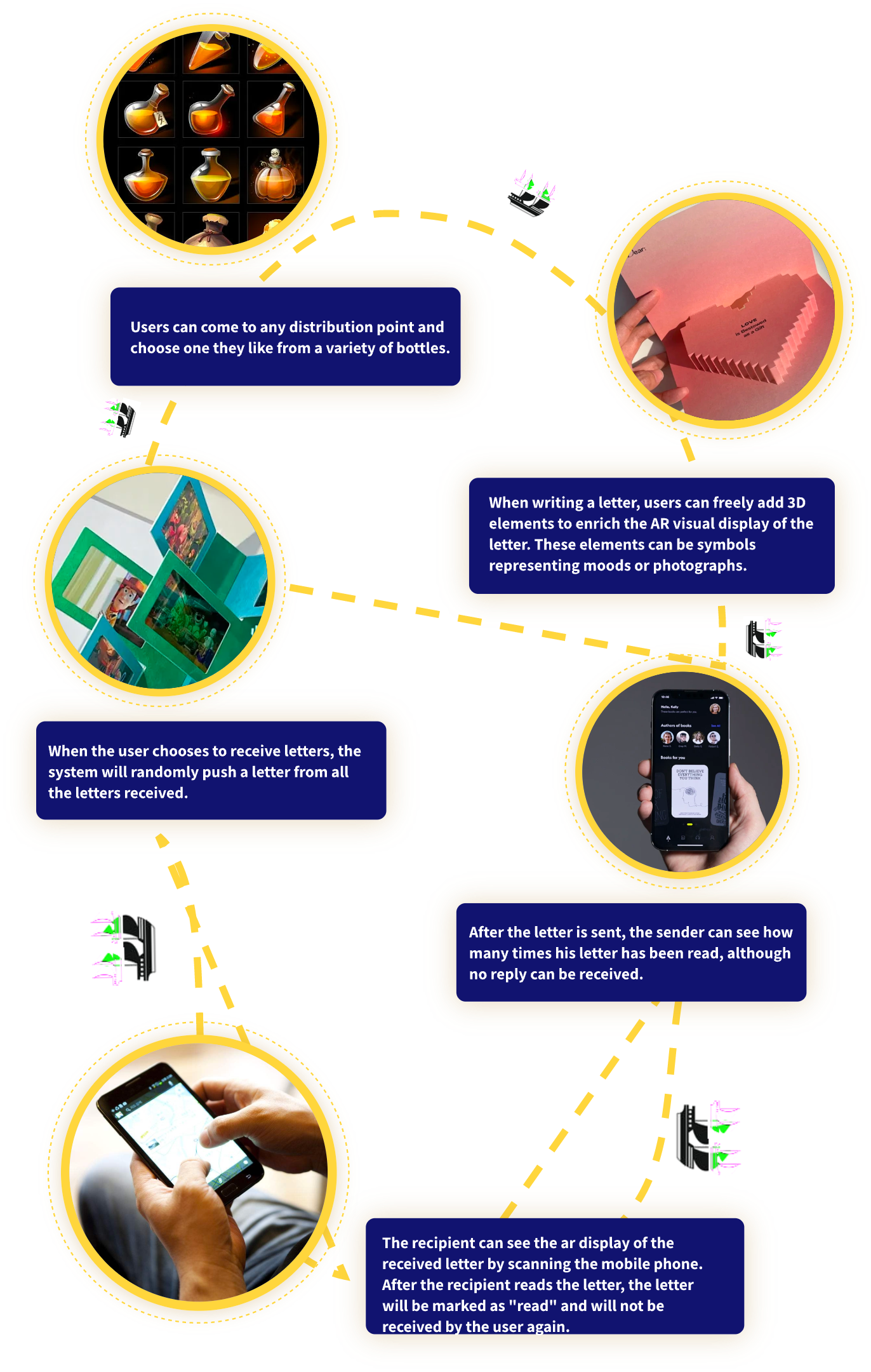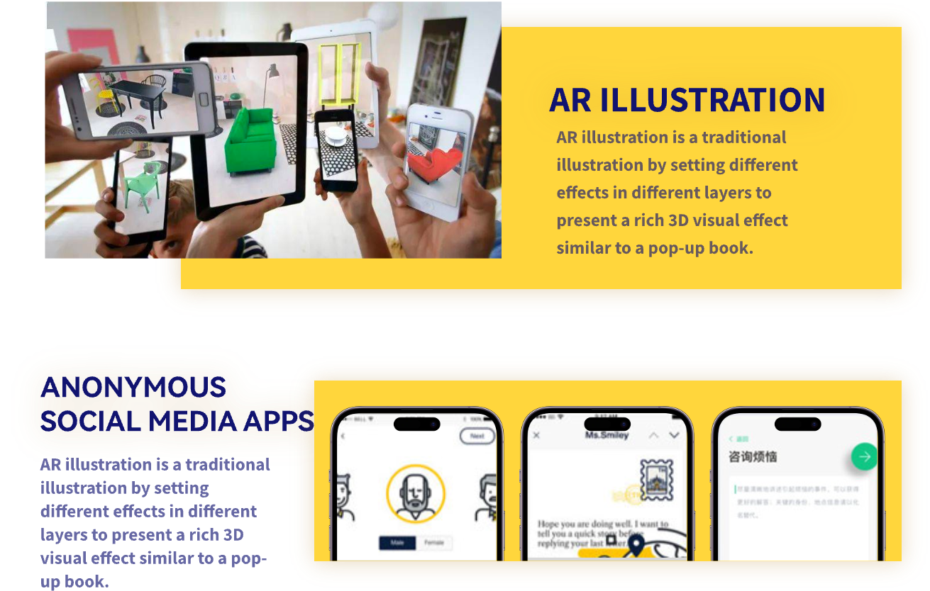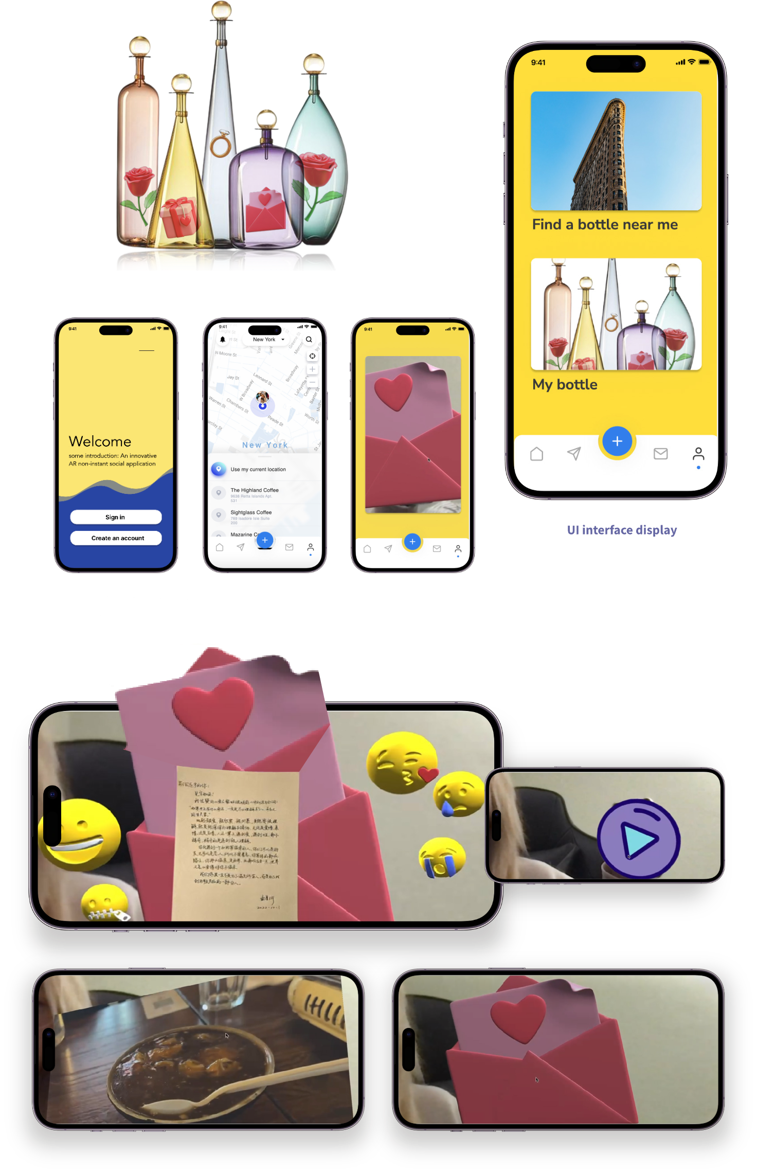 People are bound by information in their lives, and are coerced into receiving too much information, so much that one person can’t handle it. I hope to design a way of communication that is different from the current social media app, so that people can temporarily get out of the sea of information and have a moment of tranquility in the information age. The AR drift bottle app will be designed around the following core features: anonymity, socialization, and visual diversity.