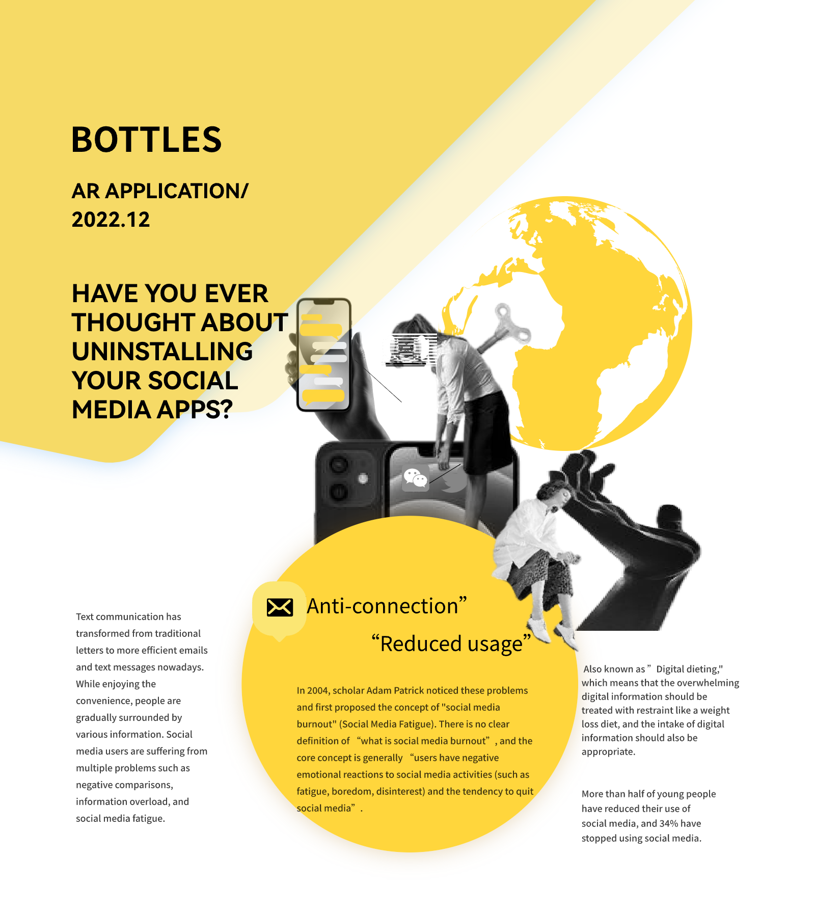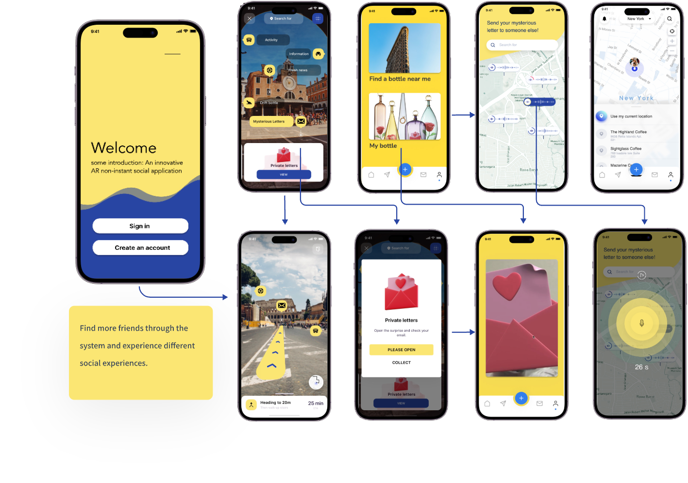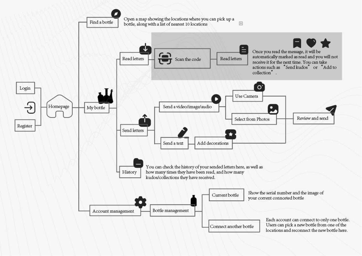 People are bound by information in their lives, and are coerced into receiving too much information, so much that one person can’t handle it. I hope to design a way of communication that is different from the current social media app, so that people can temporarily get out of the sea of information and have a moment of tranquility in the information age. The AR drift bottle app will be designed around the following core features: anonymity, socialization, and visual diversity.